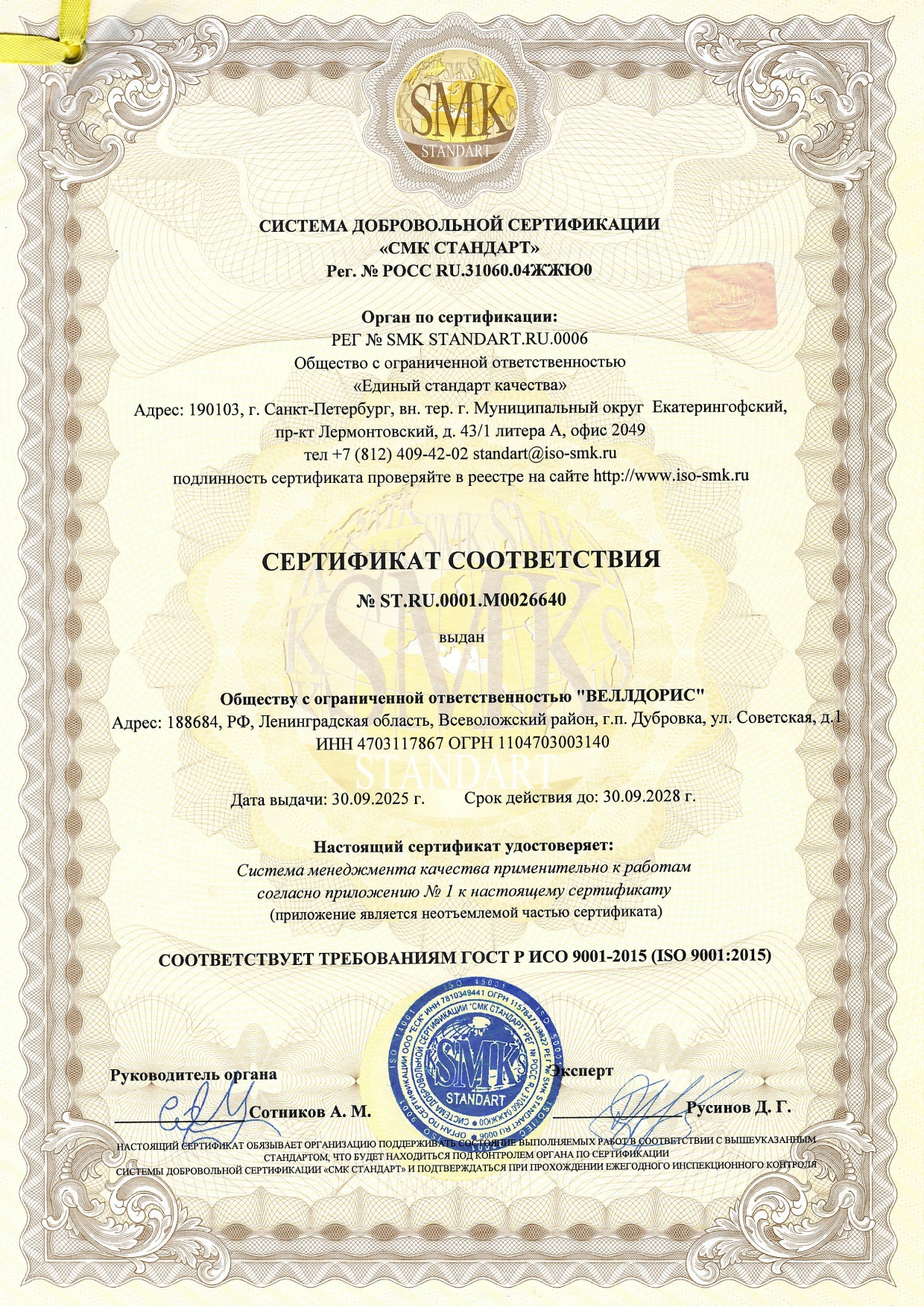 Вся продукция, производимая компанией VellDoris имеeт все необходимые сертификаты, подтверждающие их полное соответствие действующим требованиям ГОСТ и ТУ.